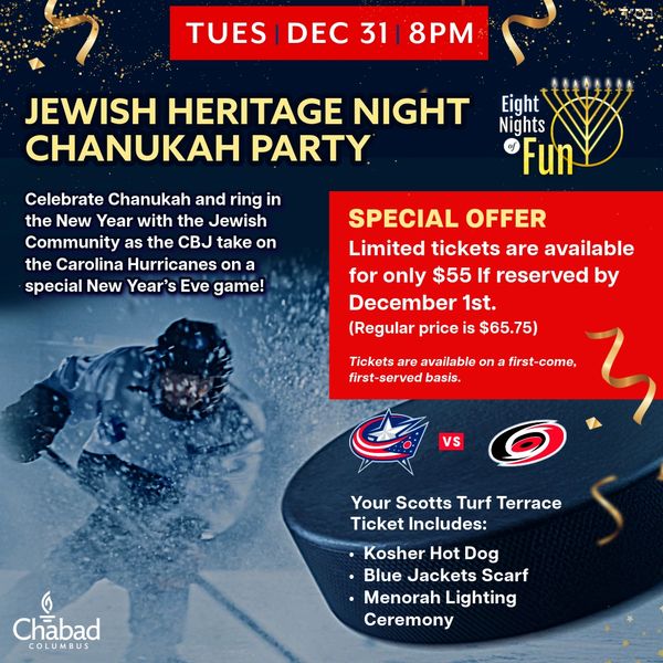 Tuesday, December 31 at 8:00 pm. Celebrate Chanukah and ring in the New Year with the Jewish Community as the CBJ take on the Carolina Hurricanes on a special New Year’s Eve game!