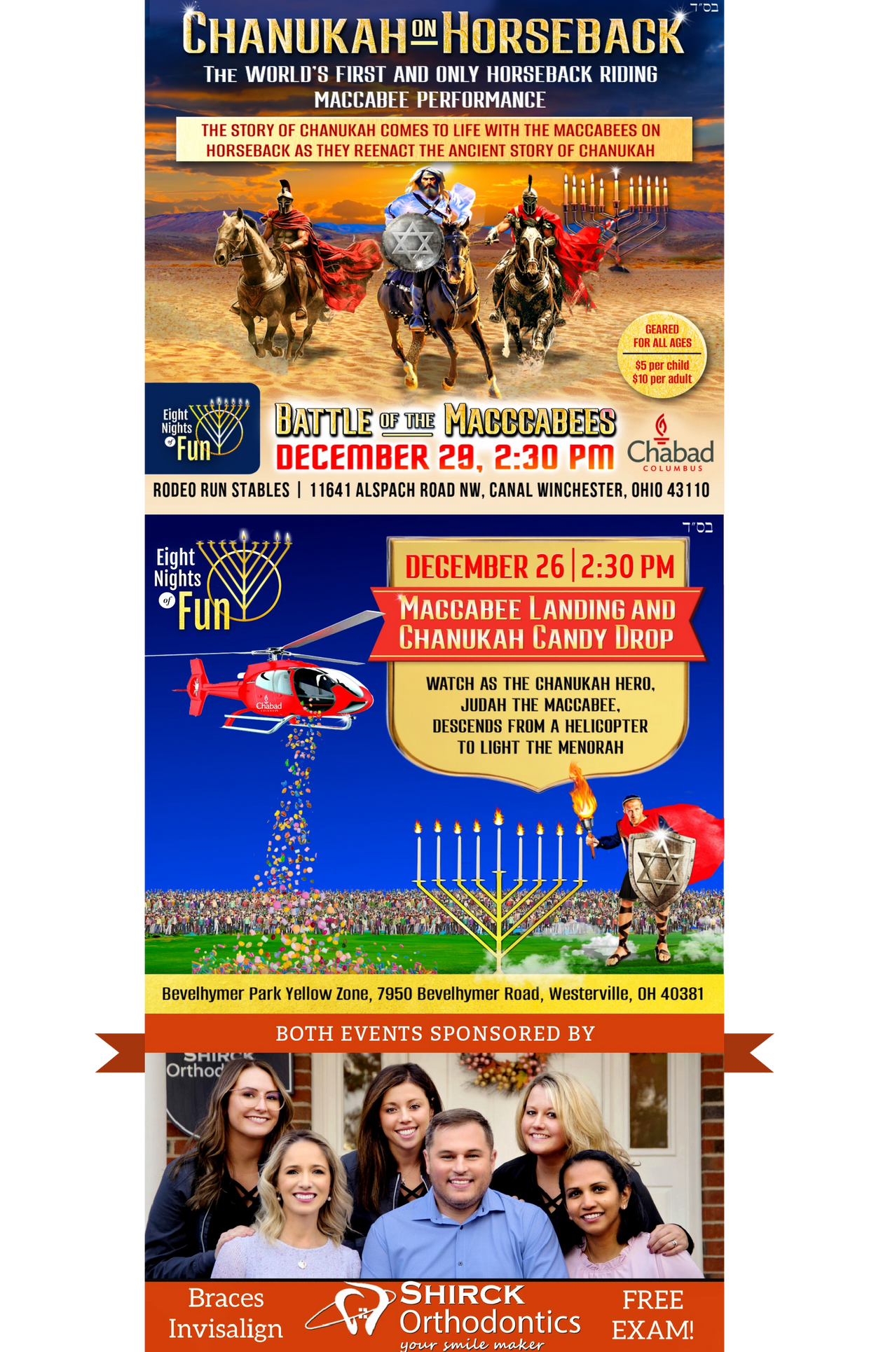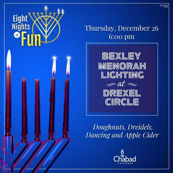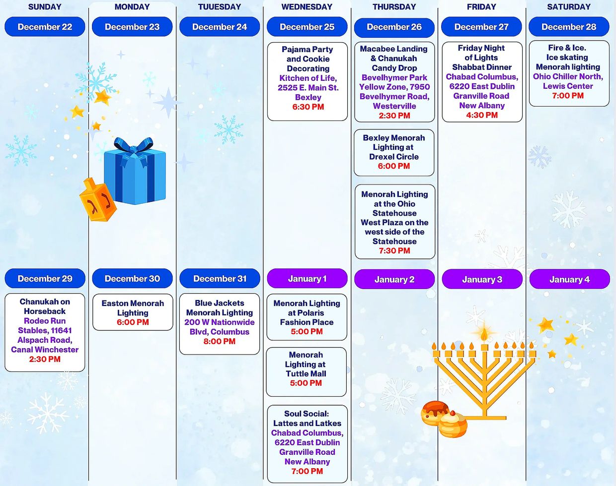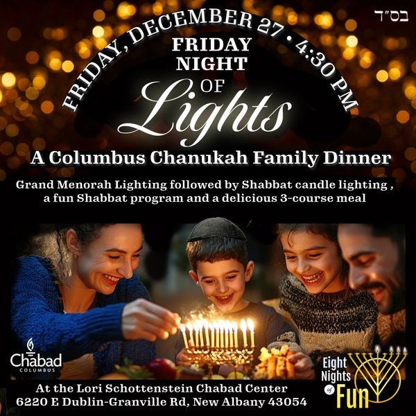 Friday, December 27 at 4:30 pm. Columbus Chanukah family dinner at the Lori Schottenstein Chabad Center. Grand Menorah lighting followed by a fun, engaging, and delicious 3-course meal.