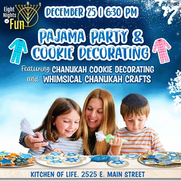 Wednesday, December 25, 6:30 pm. Featuring Chanukah Cookie Decorating and Whimsical Chanukah Crafts at Kitchen of Life, 2525 E. Main Street